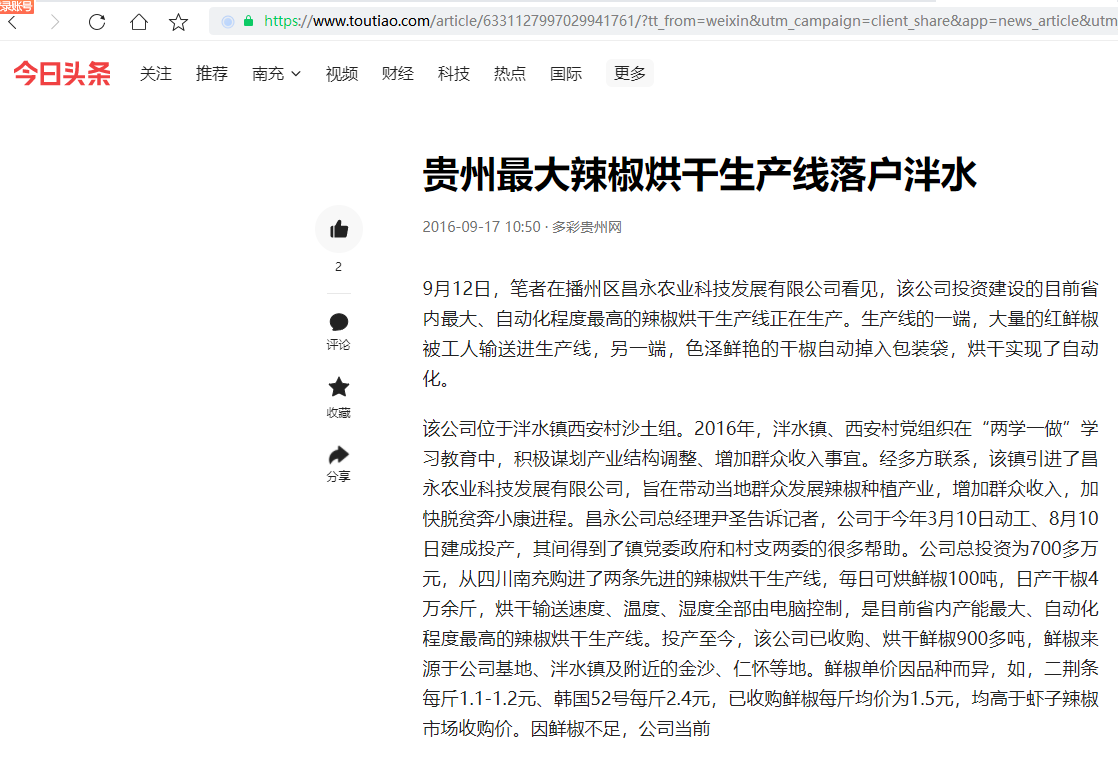 今日头条引用遵义日报的内容,报道了昌永农业科技发展有限公司 引进我公司大型辣椒烘干生产线的新闻,我公司致力于辣椒烘干多年...